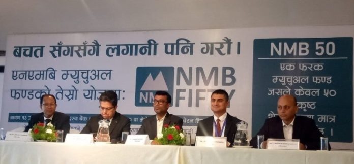 एनएमबि क्यापिटल लिमिटेडले फरक अवधारणासहित आफ्नो तेस्रो म्युचुअल फन्ड ‘एनएमबी–५०’ शुरुवात गरेको छ । शेयरमा लगानी गरी राम्रो लाभांश वितरण गर्ने उद्देश्यसहित एनएमबि क्यापिटलले तेस्रो म्युचुल फन्डको रुपमा ‘एनएमबि–५०’ लन्च गरेको हो ।