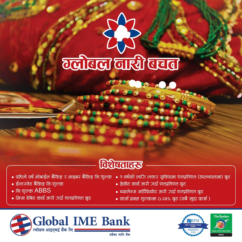 ग्लोबल आइएमई बैंकले हिन्दू महिलाको चाड हरितालिका तीजलाई लक्षित गर्दै नारी बचत खातामा विशेष छुट योजना ल्याएको छ । नारी बचत खातामा पहिलो वर्ष मोवाइल बैंकिङ र भाइबर बैंकिङ सेवा निःशुल्क रुपमा उपलब्ध हुनेछ । साथै इन्टरनेट बैंकिङ, आस्बा, भिसा डेबिट तथा क्रेडिट कार्ड जारी गर्दा लाग्ने शुल्कमा शतप्रतिशत छुट, एक वर्षसम्म ब्यालेन्स सर्टिफिकेट जारी गर्दा लाग्ने शुल्क तथा लकर सुविधा लिँदा लाग्ने शुल्कमा शतप्रतिशत छुटको व्यवस्था रहेको छ ।