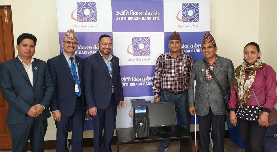 ज्योति विकास बैंकका प्रमुख कार्यकारी अधिकृत मनोज कुमार ज्ञवालीले अडियो लाइब्रेरी एण्ड रिसोर्स सेन्टर नेपालका अध्यक्ष रमेश बावु तिवारीलाई कम्प्युटरहरु हस्तान्तरण गरेका थिए । कार्यक्रममा बैंकको तर्फबाट बैंकका नायब महाप्रबन्धक पारस राज कँडेल, सहायक महाप्रबन्धक रामहरि आचार्य तथा संस्थाका उपाध्यक्ष कोपिला गुरुङ र सल्लाहकार सदस्य डा गोविन्द आचार्यको पनि उपस्थिति रहेको थियो।