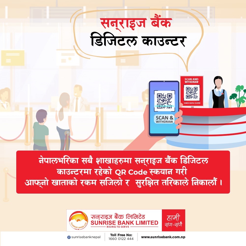 सन्राइज बैंकले बैंकका काउन्टर मार्फत नगद झिक्ने प्रक्रियालाई अझ सहज बनाउन डिजिटल टेलर सेवा सुरु गरेको छ । चेक तथा एटिएम कार्ड नभए पनि बैंक खाताबाट नगद झिक्न मिल्ने गरी बैंकले यो सेवा सुरु गरेको हो ।
