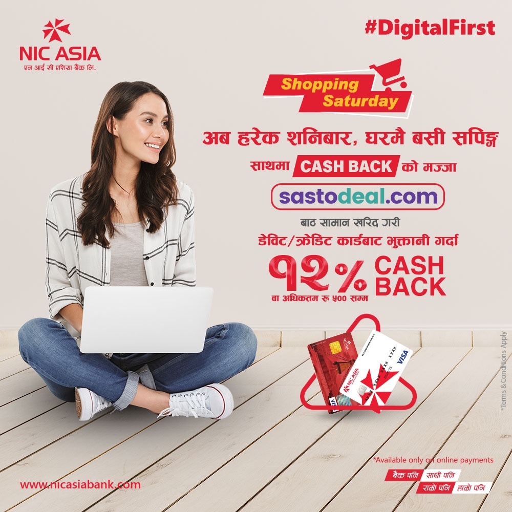 एन आई सी एशिया बैंकले आफ्ना ग्राहकहरूलाई लक्षित गरी ई–कमर्श प्ल्याटफर्म sastodeal मार्फत साताको अन्तिम दिन शनिबार किनमेल गरी भुक्तानी गर्दा १२ प्रतिशत वा अधिकतम रू। ५०० सम्म नगद फिर्ता प्राप्त गर्न सकिने योजना ल्याएको छ ।