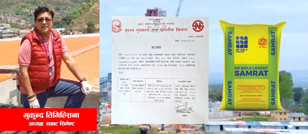 चार वाणिज्य बैंकहरुको लगानी रहेको सम्राट सिमेन्टले गुणस्तर चिन्हको चरम दुरुपयोग, नेपाल गुणस्तर तथा नापतौल विभागद्वारा कारवाही, सम्राट सिमेन्टको परिक्षण गर्दा गर्दै खुलेआम बिक्री वितरण गर्नु गैर कानुनी धन्दाः विभाग