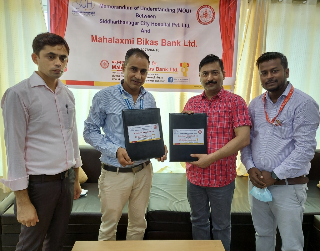 महालक्ष्मी विकास बैंक लिमिटेडले मोफसलमा रहेका आफ्ना ग्राहकहरुलाई सुलभ तथा गुणस्तरीय स्वास्थ्य सेवा प्रदान गर्ने उद्देश्यले बैंकको भैरहवा शाखाको अगुवाईमा सिद्धार्थनगर सिटी हस्पिटल प्रा. लि. सँग मिति २०७८ श्रावण १८ गते सम्झौता गरेको छ । उक्त सम्झौता अनुसार बैंकका ग्राहकहरुले सिद्धार्थनगर सिटी हस्पिटलमा उपचार गराउँदा विभिन्न सेवा शुल्कहरुमा छुट पाउनेछन् ।