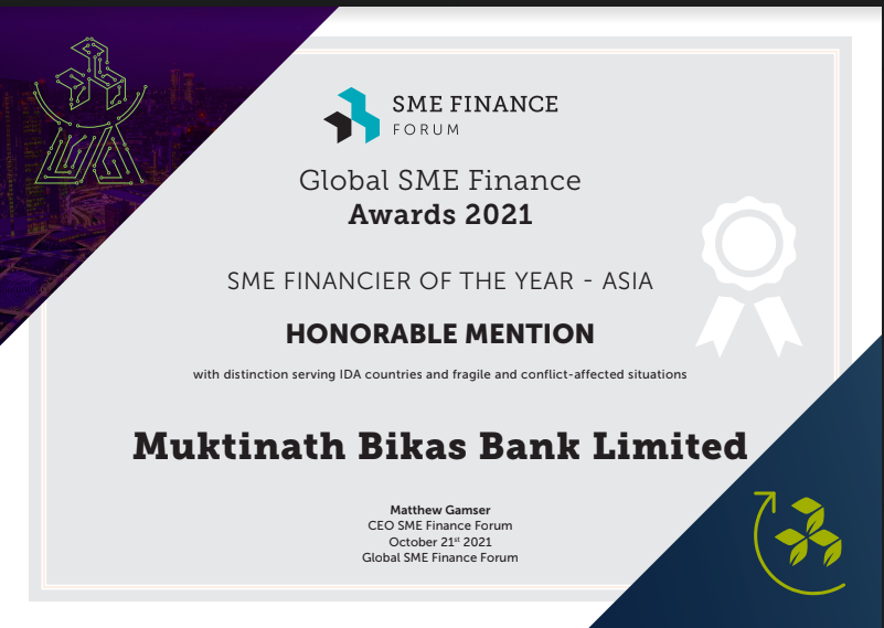 साना तथा लघुवित्त क्षेत्रमा मुक्तिनाथ विकास बैंकले पु¥याएको योगदानको कदर गर्दै मुक्तिनाथ विकास बैंकलाई “SME Financier of The Year- Asia विधामा सम्मानित भएको हो । यस सम्मानले बैंकलाई भविष्यमा यस साना तथा लघुबित्त क्षेत्रमा थप योगदान गर्नको लािग उत्साहित बनाएको छ । बैंकले यस अघि युरोपियन माइक्रो फाइनान्स अवार्ड २०२० हासिल समेत भएको थियो ।