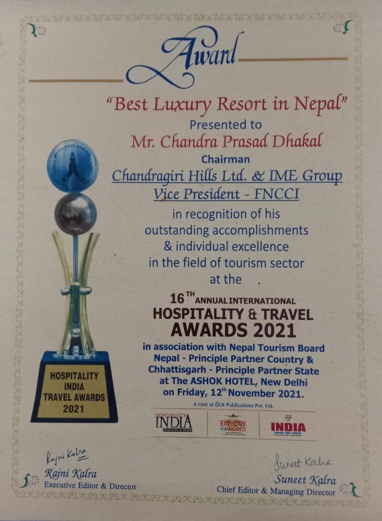 काठमाडौँको चन्द्रागिरि हिल्समा अवस्थित चन्द्रागिरि हिल्स रिसोर्टलाई यस वर्षको नेपालकै उत्कृष्ट लक्जरी रिसोर्ट पुरस्कार ‘अन्तर्राष्ट्रिय हस्पिटालिटी एण्ड ट्राभल अवार्ड २०२१’ प्रदान गरिएको छ ।