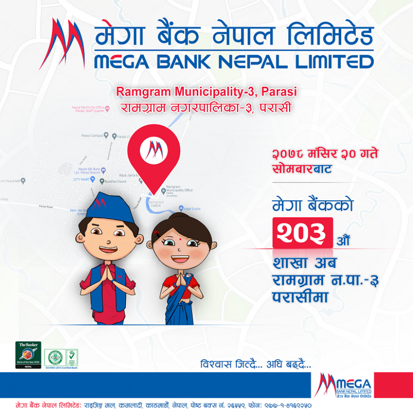 मेगा बैंकले लुम्बिनी प्रदेशको नवलपरासी जिल्ला (सुस्ता पश्चिम)को सदरमुकाम परासीस्थित रामग्राम नगरपालिका वडा नम्बर ३ मा नयाँ शाखा विस्तार गरेको हो। यो मेगा बैंकको २०३औँ शाखा हो।