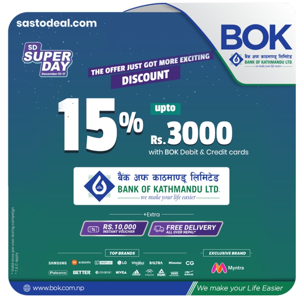बैंक अफ काठमाण्डू लिमिटेडको डेबिट तथा क्रेडिट कार्ड बाहक महानुभावहरुले सस्तो डिलको सुपर डे योजनामा रु. ३,००० सम्म छुट पाउनुहुनेछ । पछिल्लो समय ग्राहक महानुभावहरुमा प्रबिधिको प्रयोग गरि अनलाईन मार्फत आफुलाई आवश्यक विभिन्न समानहरु खरिद गर्ने बानी रहेकोले बैंकले आफ्नो कार्डबाहक महानुभावहरुलाई प्रबिधिको प्रयोगमा उत्प्रेरित गर्नुको साथै रु. ३,००० सम्मको विशेष छुटको योजना ल्याएको हो ।