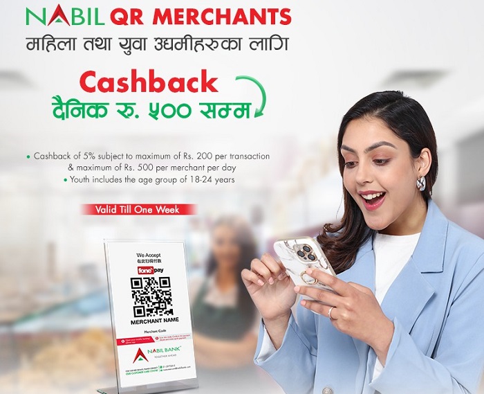 नबिल बैंकले महिला तथा युवा क्यूआर मर्चेन्टलाई लक्षित गर्दै नयाँ वर्ष २०७९ को अवसरमा क्यूआर कारोबारमा आधारित क्यासब्याक योजना सार्वजनिक गरेको छ । नबिल बैंक लिमिटेड र संयुक्त राष्ट्र पूँजी विकास कोषको सहकार्यमा आधारित “क्यूआर-कोडः महिला र युवाका लागि नबिल बैंक डिजिटल प्रवद्र्धन” परियोजना अन्तर्गत यो योजना सुरु गरिएको हो ।