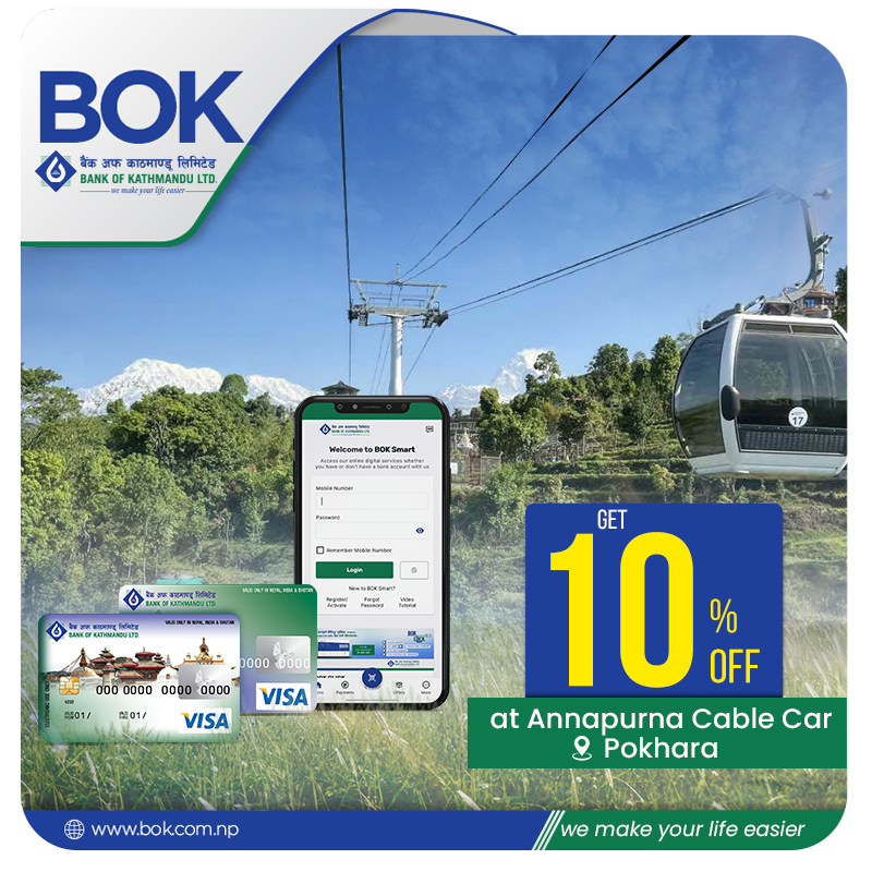 बैंक अफ काठमाण्डू लिमिटेड र अन्नपूर्ण केबल कार प्रालिबिच बैंकको डेबिट कार्ड, क्रेडिट कार्ड Swipe तथा मोबाइल बैंकिङ्ग बाट क्यूआर कोड स्क्यान गरी केबल कारको टिकट खरिद पश्चात् भुक्तानी गर्दा बैंकको आदरणीय ग्राहक महानुभावहरुलाई १० प्रतिशत छुट उपलब्ध गराउने सम्झौता भएको छ ।
