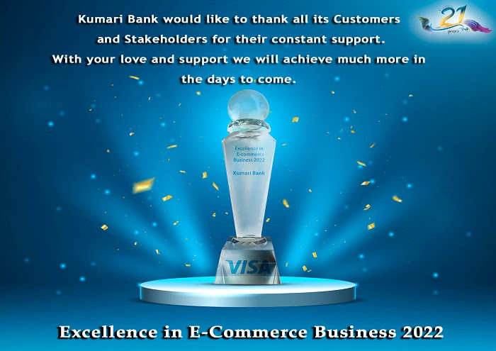 कुमारी बैंक लिमिटेडले ‘एक्सिलेन्स इन इ–कमर्स विजनेश २०२२’ को अवार्ड पाएको छ । भिसा इन्टरनेशनलद्धारा बुधबार भएको ‘लिडर्स क्याक्लेभ पेमेन्ट इनोभेशन फर डिजिटल नेपालको सम्मेलनमा बैंक सम्मानित भएको हो । यो अवार्ड कुमारी बैंकलाई अभिनव उत्पादन र कार्ड भुक्तानी उद्योगमा उच्चतम ईकमर्स व्यवसायको मात्रा हासिल गरेकोमा प्रदान गरिएको हो ।