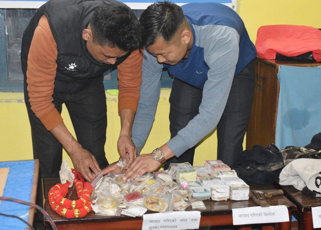 फरार रहेका एक जनाको खोजी जारी रहेको प्रनाउ राईले जानकारी दिनुभयो । उनीहरुको साथबाट नगद रु छ लाख १३ हजार तीन सय ४० सहित एक सय ४३ तोला सुन सार्वजनिक गरेको हो । बरामद गरेका नगद र सुनका गरगहनाबाहेक एक थान पेस्तोल, कर्मचारीलाई नियन्त्रणमा लिनका लागि प्रयोग गरिएको सामान (डोरी, कैचीलगायत सामग्री) सार्वजनिक गरेको छ ।