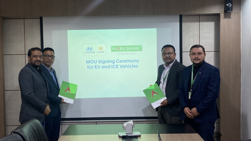 नबिल बैंक र नेपालमा हुन्डाई गाडीको आधिकारिक बिक्रेता लक्ष्मी इन्टरकन्टिनेन्टलबीच विद्युतीय सवारीसाधन (ईभी) र इन्टरनल कम्बुस्टन इन्जिन (आईसीई) भेहिकलका कर्जा सुविधा उपलब्ध गराउने सम्झौता भएको छ।