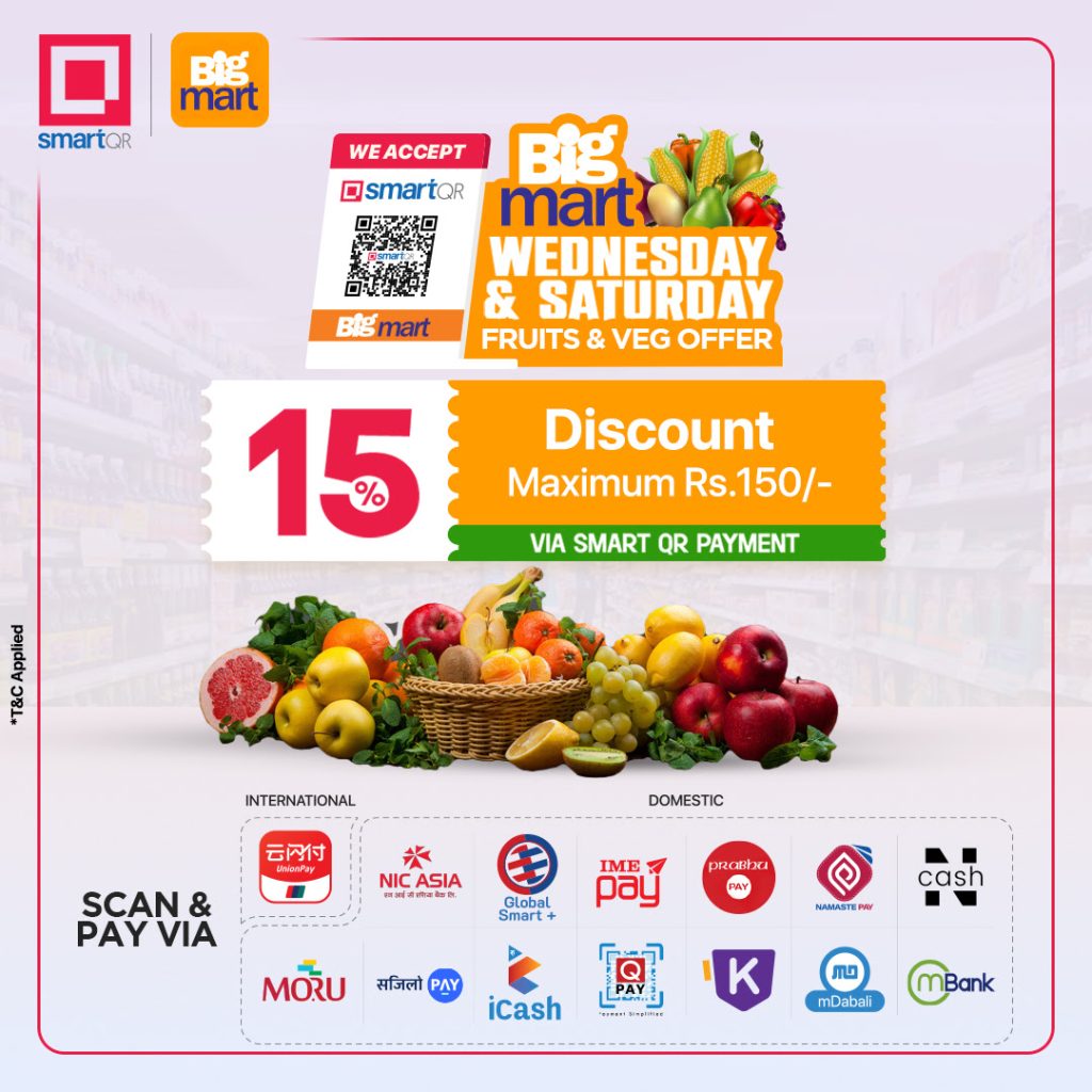 स्मार्ट क्युआरले बिग मार्टसँग सहकार्य गरि हरेक बुधबार र शनिबार तरकारी तथा फलफुल खरिदमा स्मार्ट क्युआर मार्फत भुक्तानी गर्दा छुट अफर सार्वजनिक गरेको छ ।