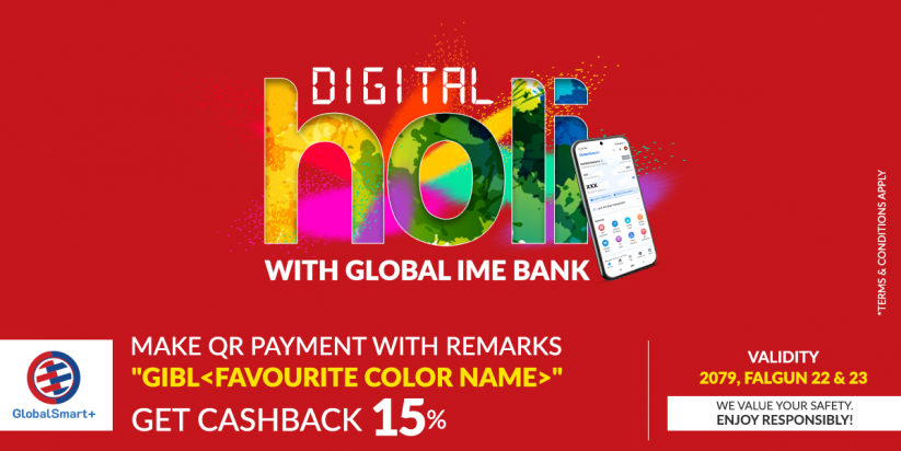 ग्लोबल आईएमई बैंकले ल्यायो डिजिटल होली योजना, क्यूआरमार्फत भुक्तानी गर्दा १५% क्यासब्याक पाइने