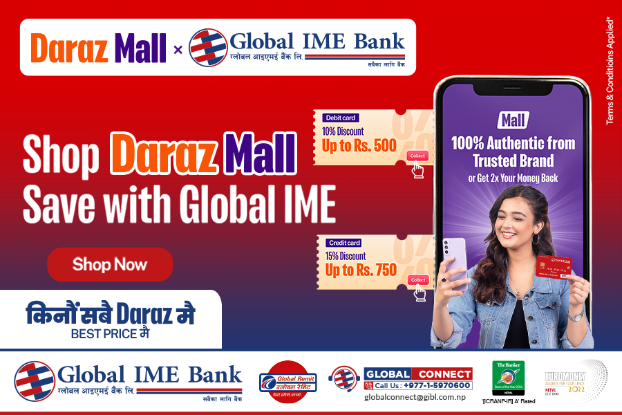 ग्लोबल आइएमई बैंक लिमिटेडका कार्ड बाहक ग्राहकहरुलाई दराजबाट ९डीमल खण्ड० अनलाइनमार्फत सामान किन्दा १५ प्रतिशतसम्म छुट पाउने योजना सार्वजनिक भएको छ । फेब्रुअरी ५ देखि अप्रिल ३० सम्म (३ महिना) संचालनमा रहने यस छुट योजनाअन्तर्गत ग्राहकहरुले ग्लोबल आइएमई बैंकको भिजा डेबिट वा क्रेडिट कार्ड प्रयोग गरी दराजबाट अनलाइनमार्फत सामान खरिद गर्दा कुल खरिद मुल्यमा १५ प्रतिशतसम्म छुट पाउनेछन् ।
