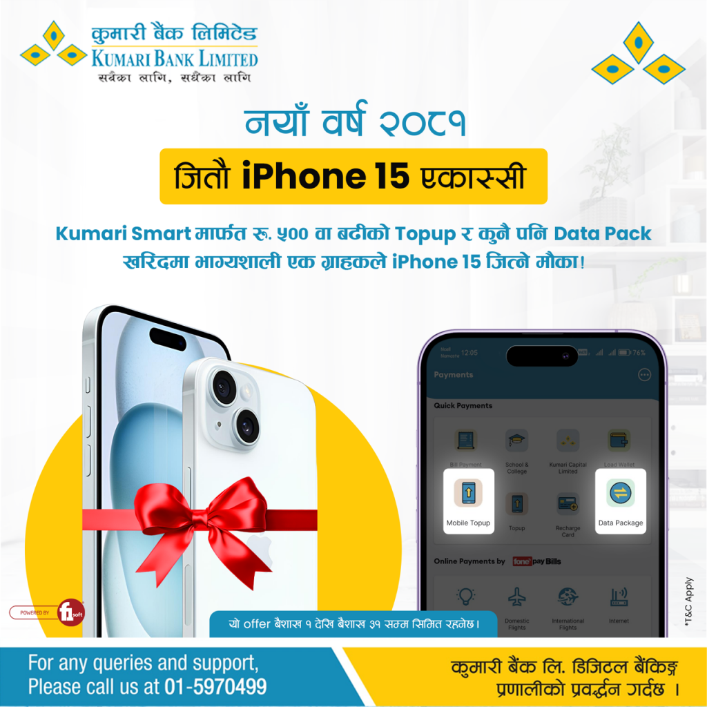 यसअन्तर्गत बैंकका नयाँ तथा पुराना ग्राहकहरूले कुमारी स्मार्ट एप प्रयोग गरी ५०० रुपैयाँको टपअप र कुनैपनि एउटा डेटाप्याक खरिद गर्दा एक भाग्यशाली ग्राहकले ब्रान्ड न्यु आइफोन १५ जित्न सक्ने बैंकले जनाएको छ।