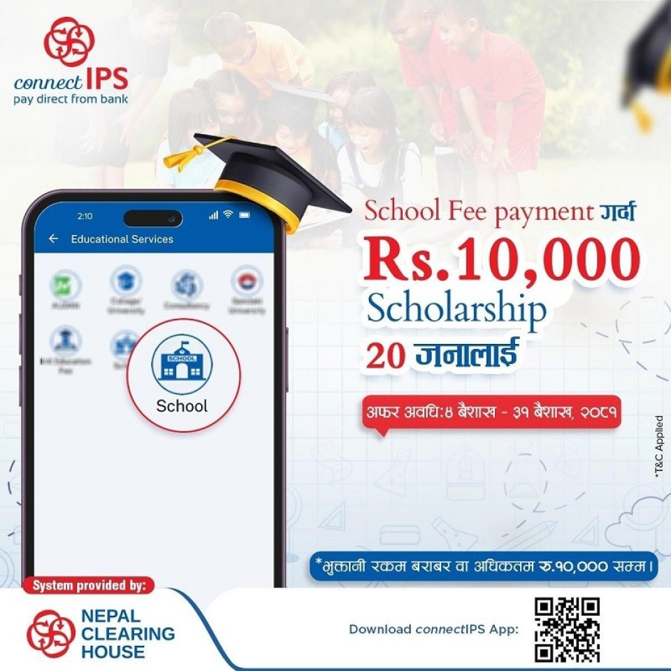 कनेक्ट आईपीएसले स्कुलको शुल्क भुक्तानी गर्दा छात्रवृत्ती पाउन सकिने अफर योजना ल्याएको छ । यो अफरअन्तर्गत २० जना भाग्यशाली विद्यार्थीहरुले भुक्तानी गरेको रकम वा अधिकतम रु १० हजारसम्मको छात्रवृत्ती रकम प्राप्त गर्न सक्नेछन् ।