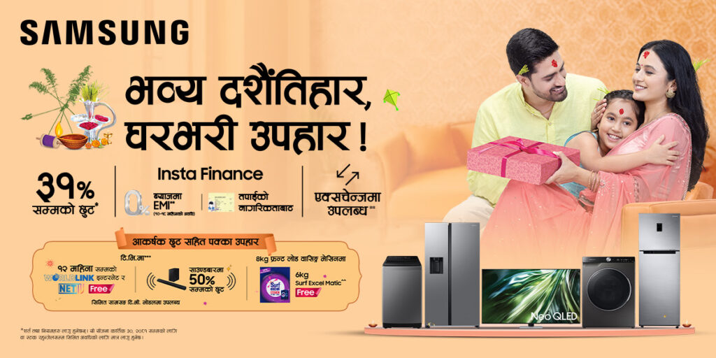 सामसङले ‘भव्य दशैं तिहार, घर भरि उपहार’ अफर सार्वजनिक गरेको छ। यो अफर आगामी कार्तिक ३० गतेसम्म संचालन हुनेछ। यो अफरमा ग्राहकहरुलाई ३१ प्रतिशत सम्मको छुटमा सामसङ टिभीहरु र घरेलु उपकरणहरु छनोट गर्ने अवसर मिल्नेछ। सामसङ टिभीहरुको खरिदमा १२ महिनासम्मको निःशुल्क वर्ल्डलिंक इन्टरनेट र नेटटिभी सब्स्क्रिप्सन पाउने कम्पनीले जनाएको छ।