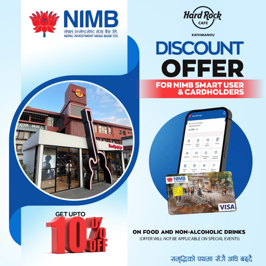 नेपाल इन्भेष्टमेण्ट मेगा बैंक (एनआईएमबी) लिमिटेड र ‘हार्ड रक क्याफे’, काठमाडौं बीच भएको सम्झौतामा एनआईएमबीका ग्राहकवर्गहरुलाई फुड एण्ड बेवरेज (नन अल्कोहोलिक) मा १०% विषेश छुट दिने भएको छ । छुट लिनका लागि ग्राहकले एनआईएमबी डेबिट÷क्रेडिट कार्ड वा एनआईएमबी स्मार्ट एप (मोबाईल बैंकिङ) मार्फत भुक्तानी गर्नुपर्ने हुन्छ ।