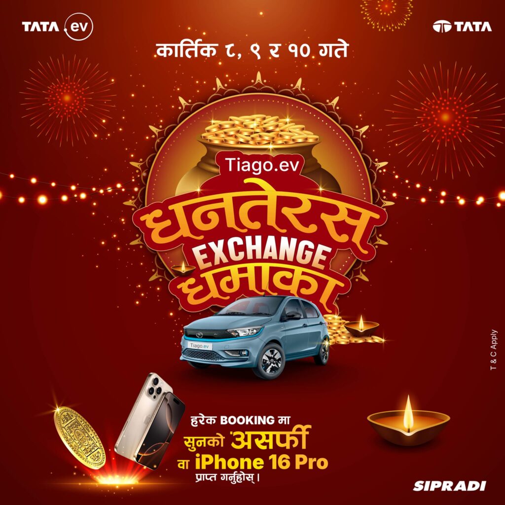 यस वर्षको धनतेरसलाई लक्षित गरेर यही कार्तिक ८, ९, र १० गते टियागो इभि धनतेरस एक्सचेन्ज धमाका टाटा मोटर्सको देशैभरी रहेका शोरुमहरुमा आयोजना गर्न लागेको कम्पनिले जनाएको छ। यस मेलामा सहभागी भएर ग्राहकहरुले टियागो इभिको हरेक बुकिङ्गमा सुनको असर्फी वा आइ फोन १६ प्रो प्राप्त गर्न सक्नेछन्।