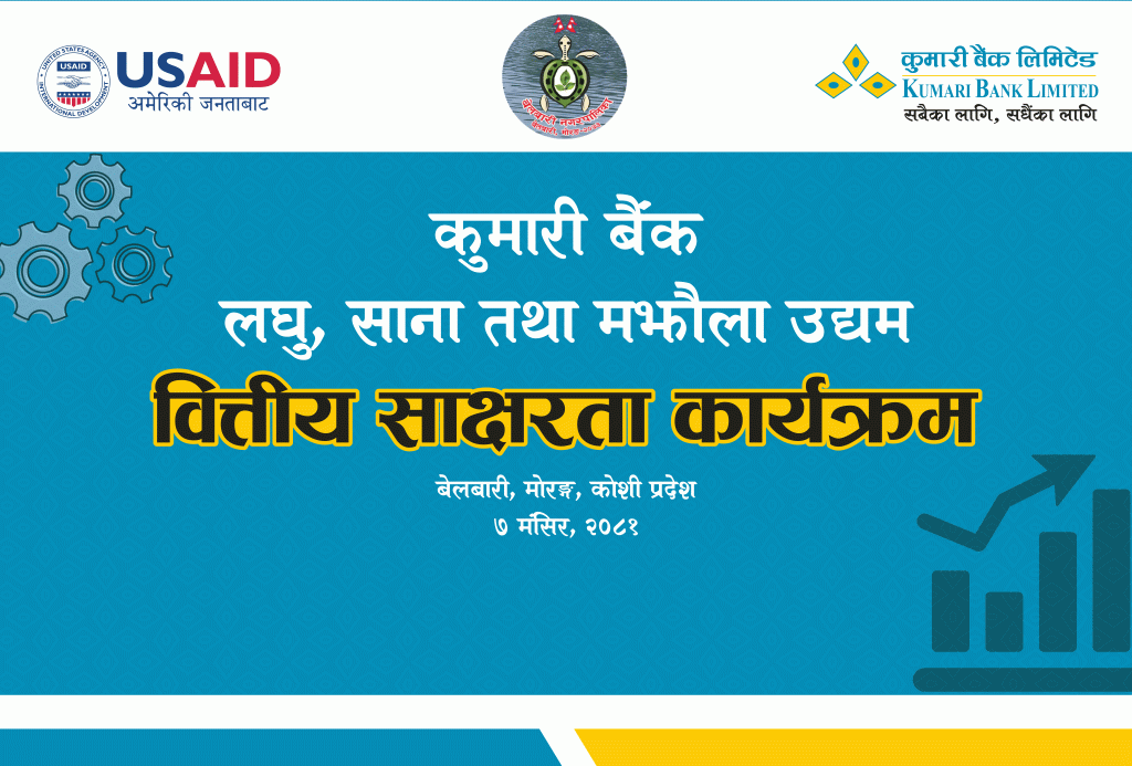 कुमारी बैंकले मोरङको बेलबारी नगरपालिकासँगको समन्वयमा बेलबारीका उद्यमीहरूको व्यावसायिकता विकासका लागि प्रशिक्षण कार्यक्रम आयोजना गरेको छ ।उद्यमी प्रशिक्षणबाट हरेक स्थानीय निकायमा रहेका उद्यमी सोचहरूको प्रवर्द्धन तथा विकासमा टेवा पुर्याउँदै आर्थिक रूपमा समृद्ध परिवार, समाज तथा राष्ट्र निर्माणमा टेवा पुग्ने विश्वास बैंकले लिएको छ ।