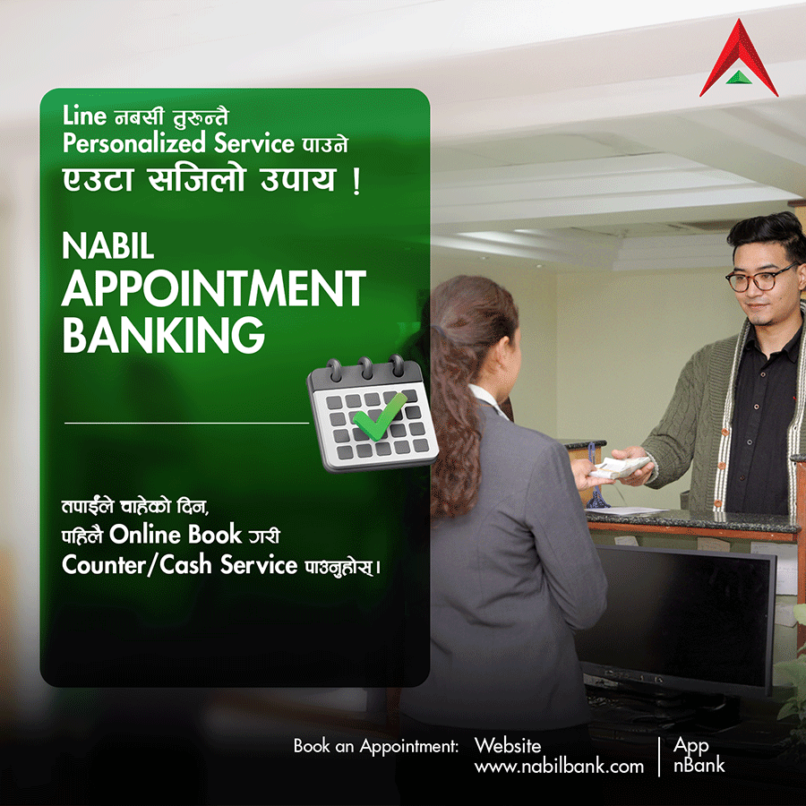 ग्राहकले नबिल बैंकको वेबसाइट वा एनबैंक एपमार्फत सजिलै अपोइन्टमेन्ट बुक गर्न सक्ने व्यवस्था गरिएको छ । ग्राहकहरूले नबिल बैंकको वेबसाइट वा एनबैंक एप प्रयोग गरी सजिलै अपोइन्टमेन्ट बुक गर्न सक्छन् । ग्राहकले बैंकमा जानु अघि उल्लेखित प्लेटफममार्फत लिनुपर्ने सेवा र आफूलाई सहज हुने समय छनोट गर्ने सुविधा दिइएको छ । यसले समय व्यवस्थापनलाई ठुलो सहयोग पुर्याउने विश्वास गरिएको छ।