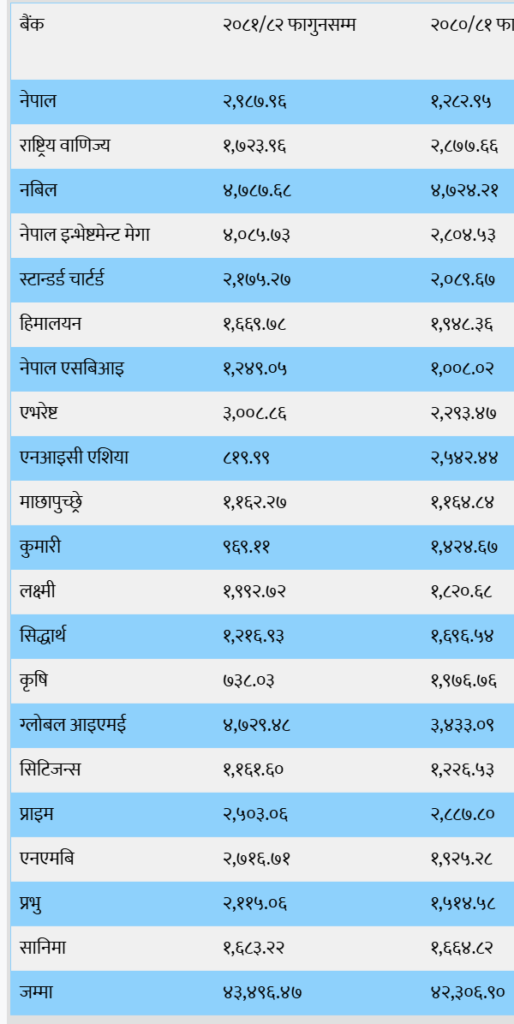 वाणिज्य बैंकहरुको मुनाफा रु दश लाखमा