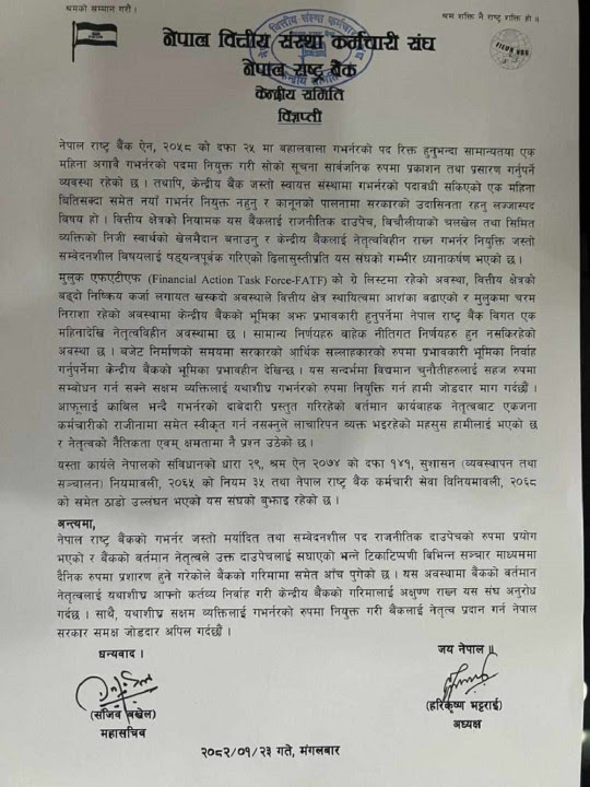 ‘गभर्नरका दाबेदार वर्तमान कार्यवाहक नेतृत्वबाट एक जना कर्मचारीको राजीनामा समेत स्वीकृत गर्न नसक्नुले नेतृत्वको क्षमतामाथि नै प्रश्न उठेको छ’, विज्ञप्तिमा भनिएको छ। कामु डा. ढुंगानाको क्षमतामा प्रश्न उठाउँदै संघले नेपालको श्रम ऐन धारा २९ , श्रम ऐन २०७४, सुशासन नियमावली २०६५ र नेपाल राष्ट्र बैंक कर्मचारी सेवा विनियमावली २०६८ को ठाडो उल्लंघन गरेको विज्ञप्तिमा उल्लेख छ।