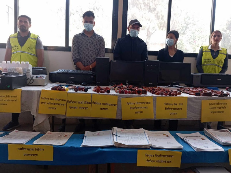 उनीहरूको साथबाट ४२ थान माइग्रेसन सर्टिफिकेट, ६० थान क्यारेक्टर सर्टिफिकेट, ११० थान एकेडेमिक ट्रान्सक्रिप्ट, ५ थान म्यारिज रजिस्टेशन सर्टिफिकेट, ५० थान प्रोभिजनल सर्टिफिकेट, १० थान जग्गाधनी दर्ता प्रमाण बरामद गरेको प्रहरीले जनाएको छ । उनीहरूको साथबाट विभिन्न सहकारी संस्थाका लेटर प्याडहरू, विभिन्न बैंक तथा सहकारीहरूको स्टेटमेन्ट पानाहरू, स्थानीय तहबाट प्रदान गर्ने विभिन्न किसिमका सिफारिस पत्रहरू बरामद गरिएको प्रहरीले जनाएको छ ।