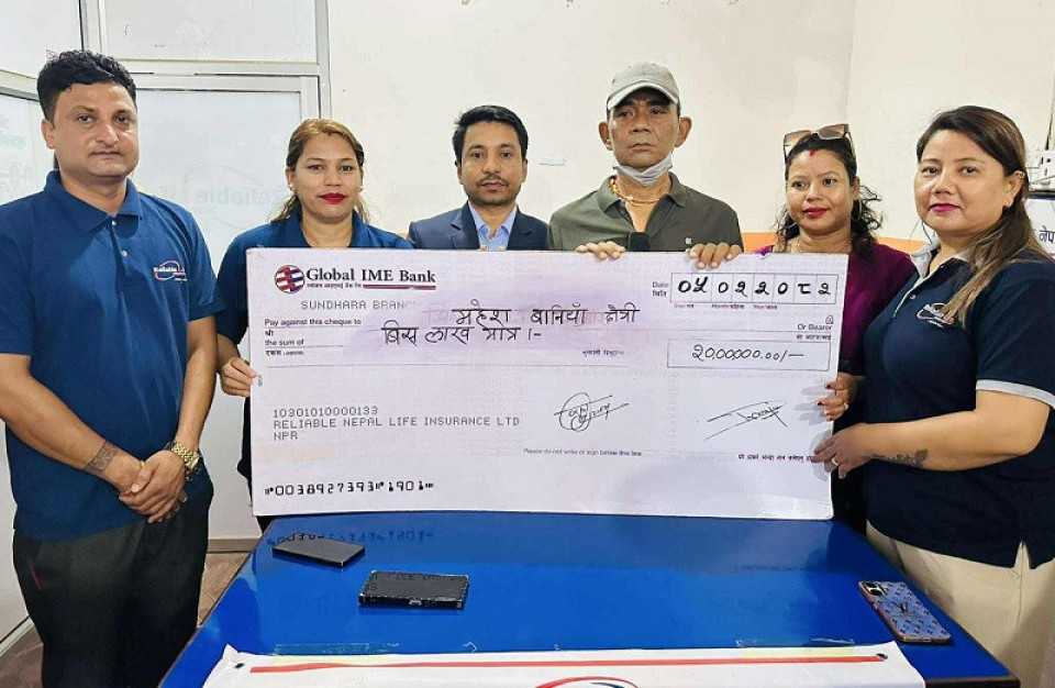 रिलायबल नेपाल लाइफ इन्स्योरेन्स लिमिटेडले रु.२० लाख रुपैयाँंको घातक रोगवापतको बीमा दाबी भुक्तानी हस्तान्तरण गरेको छ । २०७७ साल चैत महिनामा कम्पनीको हाकिमचोक शाखा, भरतपुर, चितवनबाट १५ बर्षको बीमा अवधी रहने गरी २० लाखको जीबन बीमालेख खरिद गरेका भरतपुर–घ, चितवन निवासी महेश बानीयांलाई उक्त रकम दाबी भुक्तानी हस्तान्तरण गरेको हो ।
