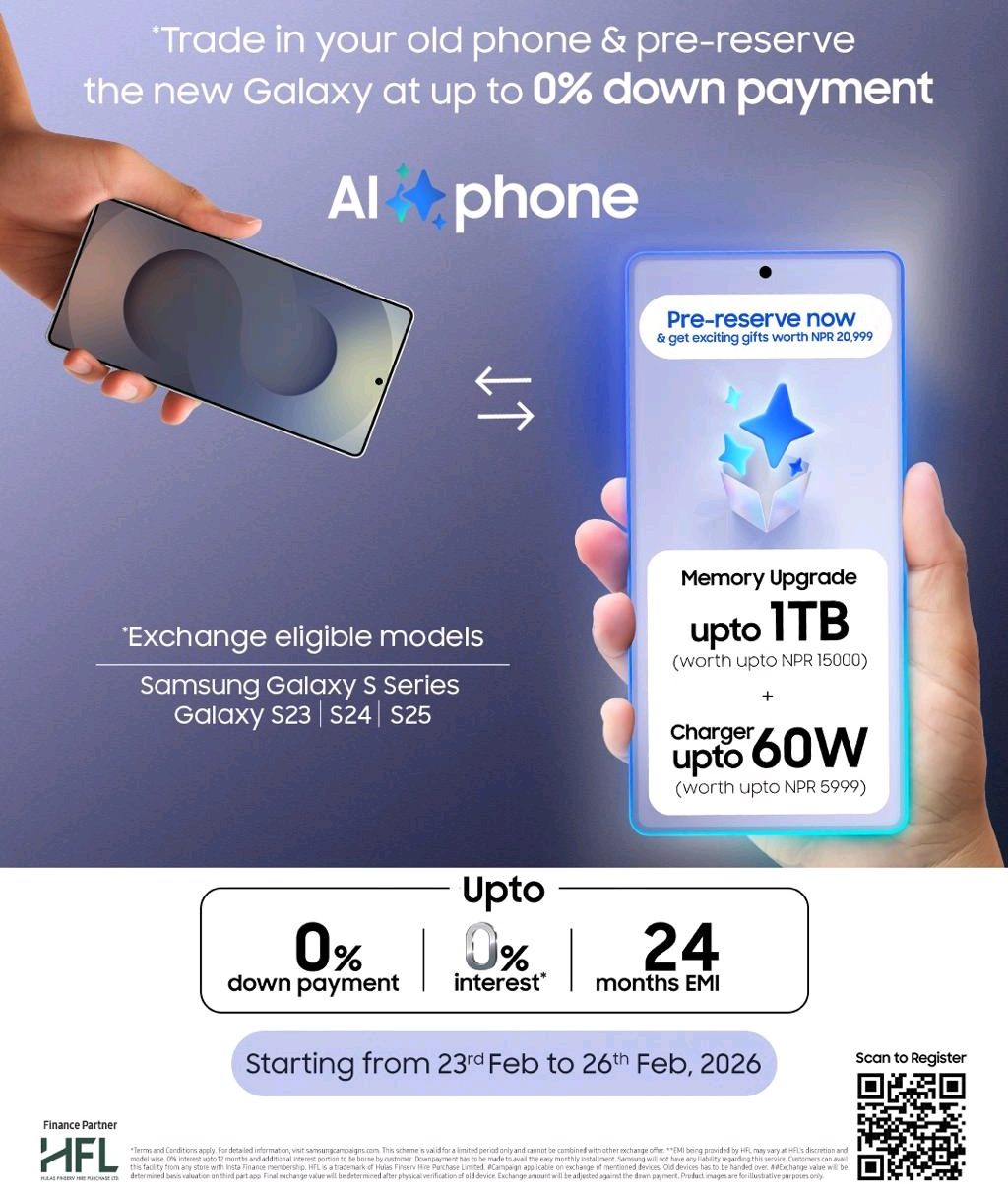 विश्वविख्यात प्रविधि कम्पनी सामसङले आफ्नो आगामी ग्यालेक्सी स्मार्टफोनको आधिकारिक लन्च हुनुभन्दा अघि नै ग्राहकहरूका लागि आकर्षक प्रि–रिजर्भ अफर सार्वजनिक गरेको छ। यस विशेष योजना अन्तर्गत ग्राहकहरूले नयाँ ग्यालेक्सी स्मार्टफोनको अग्रिम बुकिङ गर्दा अधिकतम रु. २० हजार ९९९ सम्मको विशेष लाभ प्राप्त गर्न सक्नेछन्। सामसङले आफ्ना प्रारम्भिक ग्राहक र ब्रान्डप्रति निष्ठावान प्रयोगकर्ताहरूलाई लक्षित गर्दै यो सीमित […]