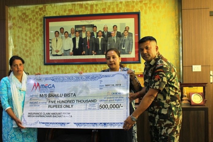 मेगा बैंककी सीईओ अनुपमा खुञ्जेलीले नेपाली सेनाका लेफ्टिनेन्ट कर्णेल प्रकाश थापाको उपस्थितिमा स्वर्गीय घिमिरेकी पत्नी शिलु विष्टलाई पाँच लाख रुपैयाँको चेक हस्तारन्तरण गरेकी छिन् । मेगा बैंकमा ‘मेगा कर्मचारी बचत खाता’ खोलेका दिंवगत जमदार घिमिरेलाई मेगा बैंकले सोही खाताको बीमा बापत पाँच लाख रुपैँया हस्तारन्तरण गरेको हो ।