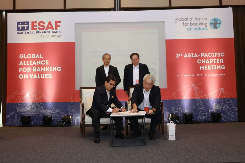 ग्लोबल एलाइन्स फर बैंकिङ्ग अन भ्यालुज (जीएबीभी) को भारतको कोचीमा सम्पन्न तेस्रो एसिया प्यासिफिक च्याप्टरको बैठकका क्रममा एनएमबि बैंकका प्रमुख कार्यकारी अधिकृत सुनिल के.सी. र डीकेसीका प्रमुख निर्देशक (चिफ डाइरेक्टर) मोबुयुकी नित्ताले सहमतिपत्रमा हस्ताक्षर गर्नुभयो ।