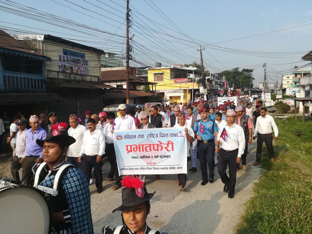 संविधान तथा राष्ट्रिय दिवस, २०७६ मूल समारोह समितिको आयोजनामा चन्द्रगढीको लेकनाथ चोकबाट शुरु गरिएकोे प्रभातफेरी ट्रेड युनियन चोकमा पुगी कोणसभामा परिणत भएको थियो । कोणसभालाई सम्बोधन गर्दै समितिका संयोजक तथा जिसस प्रमुख सोमनाथ पोर्तेलले जनताको सङ्घर्ष र शहीदको बलिदानबाट प्राप्त संविधान कार्यान्वयनमा ल्याई अब मुलुकलाई समृद्धिको बाटोतर्फ लैजानुपर्ने बताउनुभयो । भद्रपुर नगरपालिकाका प्रमुख जीवनकुमार श्रेष्ठले नयाँ संविधान सबैको साझा दस्तावेज भएको बताउँदै नेपाललाई थप बलियो, समृद्ध र मर्यादित बनाउने काम संविधानले नै गरेको बताउनुभयो ।