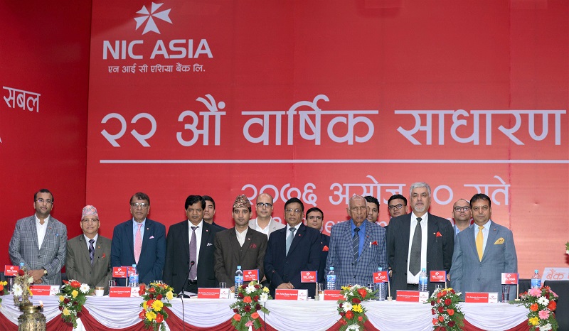 एनआईसी एसिया बैंकको २२औं वार्षिक साधारण सभा शुक्रबार सम्पन्न भएको छ । उक्त साधारणसभाले चुक्ता पूँजीको २१.०५२६ प्रतिशतका दरले १ अर्ब ८५ करोड ९८ लाख ३७ हजार ६ सय २१ रुपैयाँ लाभांश वितरण गर्ने प्रस्ताव पारित गरेको छ ।