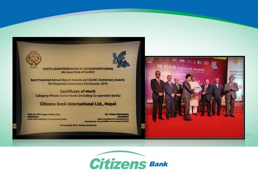सिटिजन्स बैंक इन्टरनेसनल लिमिटेडलाई South Asian Federation of Accountants (SAFA)द्वारा मिति २०७६ मंसिर १४ गते बंगलादेशको ढाकामा आयोजित एक समारोहमा बैंकलाई SAFA Best Presented Annual Report Awards and SAARC Anniversary Awards for Corporate Governance Disclosures, 2018 बाट पुरस्कृत गरिएको छ ।