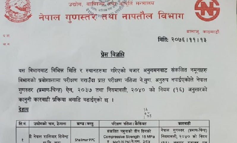 नेपाल गुणस्तर तथा नापतौल विभागले तीनवटा सिमेन्ट र एउटा स्टिल उद्योगको उत्पादन कम गुणस्तरीय पाइएपछि कारबाही गरेको छ ।