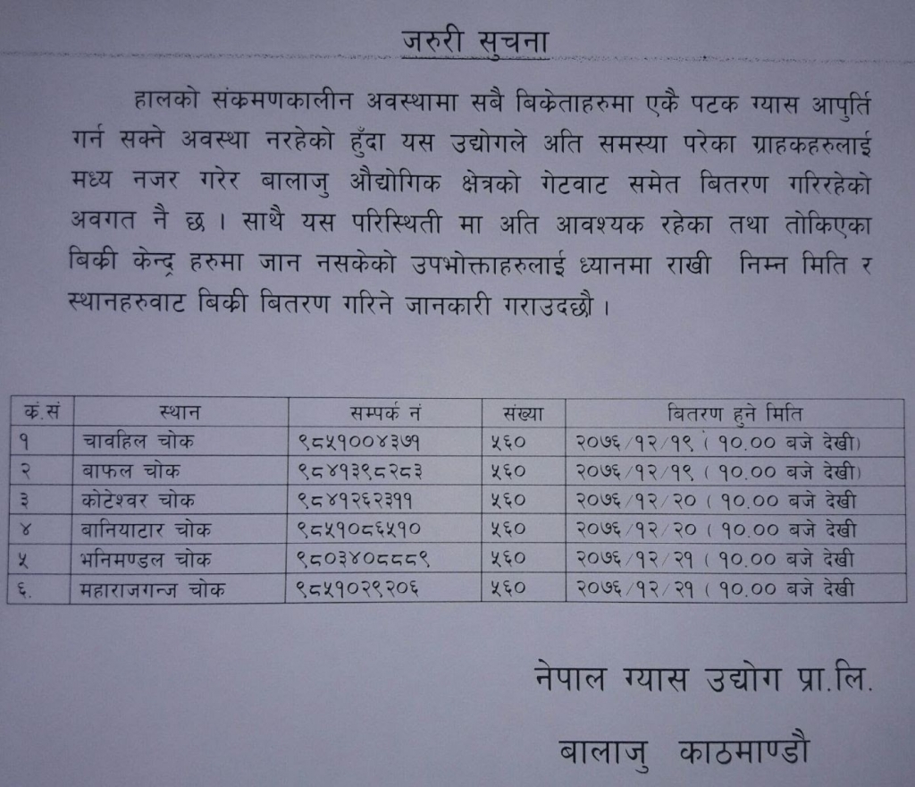 भनिमण्डल चोक र महाराजगंज चोकमा शुक्रबार ग्यास बिक्री गरिने उनले बताए। सबै क्षेत्रमा ५ सय ६० सिलिण्डर ग्यास बिक्री हुने बताउँदै उनले सुरक्षाकर्मीले त्यति संख्याका उपभोक्तालाई मात्रै लाइनमा राख्ने बताए।