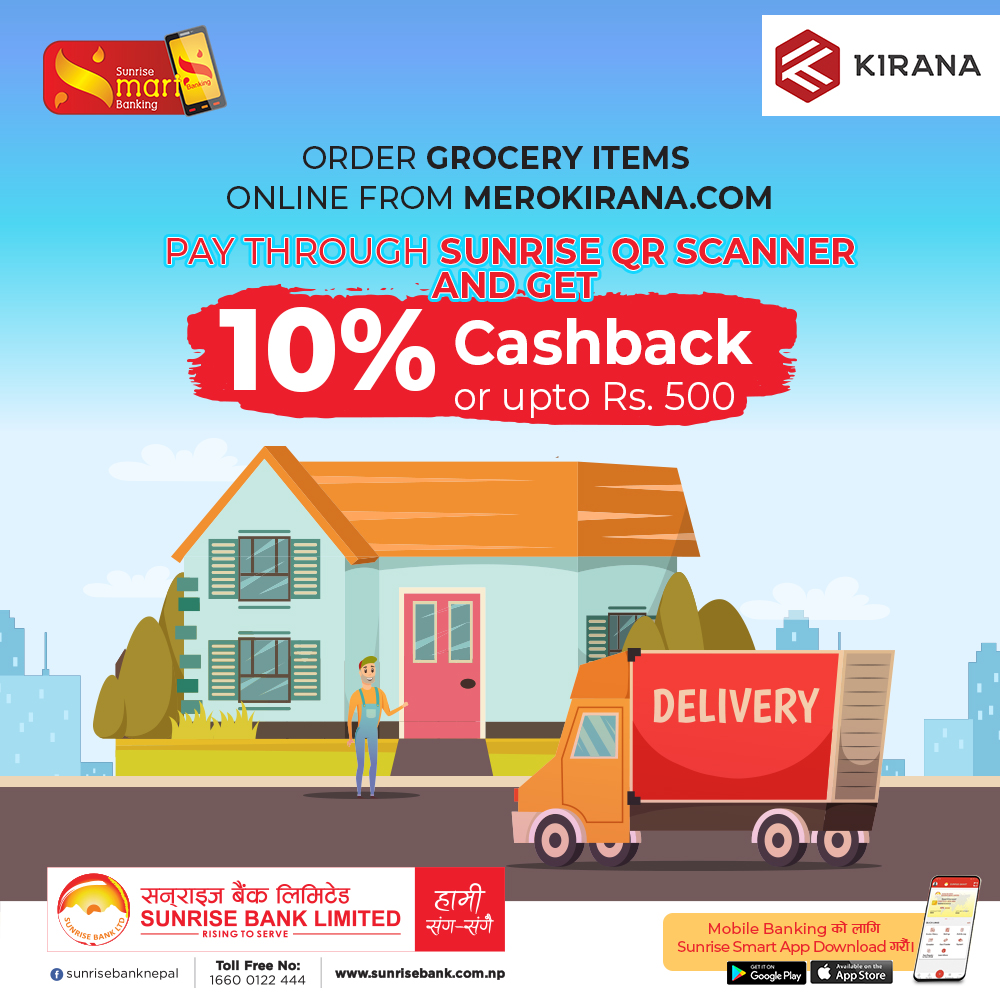 सनराइज बैंकले आफ्ना ग्राहकहरुलाई घरमै बसेर सामान खरिद गर्दा विशेष छुट दिने व्यवस्था गरेको छ । ग्राहकहरुको सेवा र सुविधालाई मध्यनजर गर्दै बैंकले हालको लकडाउनको अवस्थामा पनि मेरो किरानामा गरिएको अर्डरका लागि सन््राइज बंैकको क्यूआर कोड प्रयोगगरी सामान खरिद गर्ने प्रत्येक ग्राहकलाई १० प्रतिशत वा ५०० रुपैयाँसम्म क्यास ब्याक प्रदान गर्ने छ ।