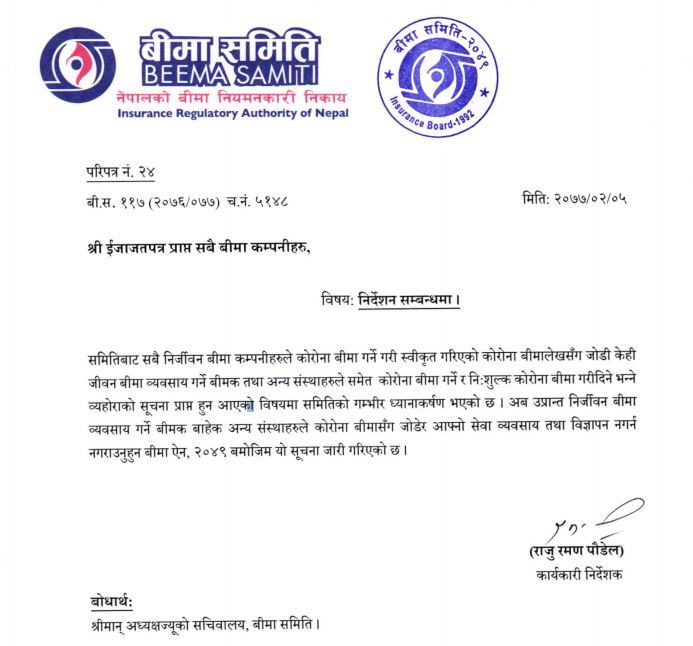 बीमा समितिले जीवन बीमा कम्पनी तथा अन्य संस्थाहरुलाई कोरोना बीमा नगर्न निर्देशन दिएको छ ।