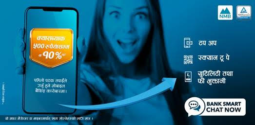 एनएमबि बैंकले भाइवर र मेसेन्जर मार्फत खोल्न सकिने खातामा पहिलो पटकको मोबाइल बैंकिङ्ग कारोवारमा १० प्रतिशत छुट वा रु. ५०० सम्मको नगद फिर्ता योजना प्रस्तुत गरेको छ । दैनिक उपभोग्य बस्तुको भुक्तानी, टप–अप र स्क्यान टु पे भुक्तानीमा पनि छुट र नगद फिर्ताको व्यवस्था उपलब्ध छ ।