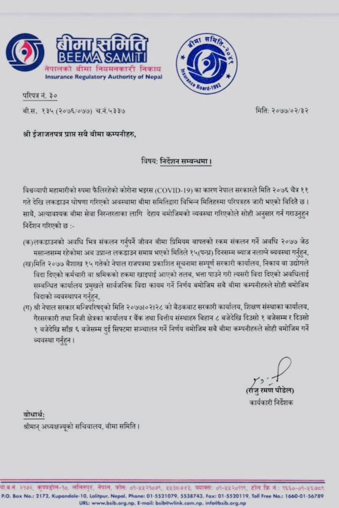 नेपालमा सञ्चालित १९ वटै बीमा कम्पनीहरुले असार १५ गतेभित्रमा लकडाउन अवधीको बीमा शुल्क यही असार १५ गतेभित्र बुझाउन सामाजिक सञ्जालमा सूचना जारी गरेका छन् । सो मिति भन्दा ढिला भएमा जरिवना थप हुने समेत जनाएका छन् । सो आधारमा आगामी असार १६ गतेदेखि लकडाउन अवधीको बीमा शुल्क बुझाउँदा जरिवना तिर्नुपर्नेछ ।