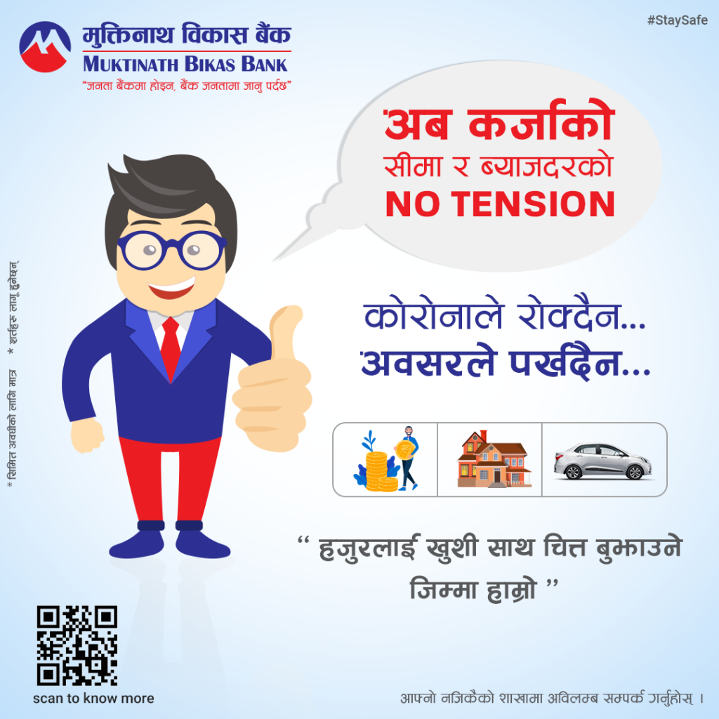 यसका साथै, बैंकबाट कर्जा लिनु भएका ग्राहकहरुले २०७७ असार मसान्तको कर्जाको तिर्न बाँकी सांवा र ब्याज यही २०७७ श्रावण मसान्तसम्ममा चुक्ता गर्नुभएमा कर्जाको ब्याजदरमा २ प्रतिशत सम्मको छुट प्रदान गर्ने व्यबस्था बैंकले ल्याएको छ ।