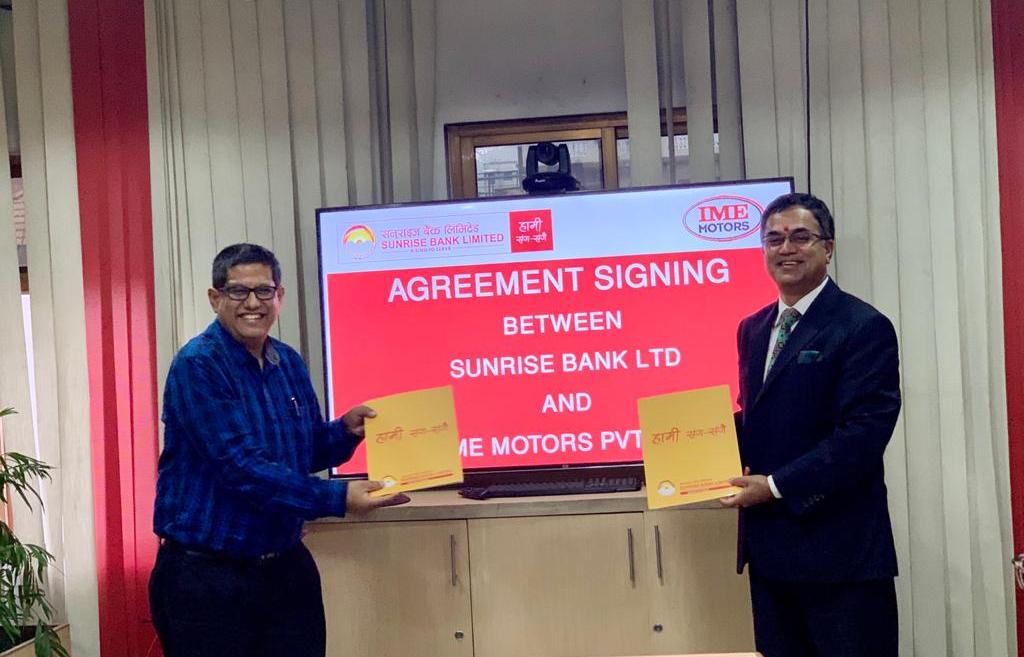 सनराइज बैंक र आई एम ई समूहद्वारा संचालित नेपालका लागि Ashok Leyland Brand का विभिन्न सवारी साधनको आधिकारीक बिक्रेता आई एम ई मोटर्स प्राइभेट लिमिटेड बिच सहमतिपत्रमा हस्ताक्षर भएको छ ।