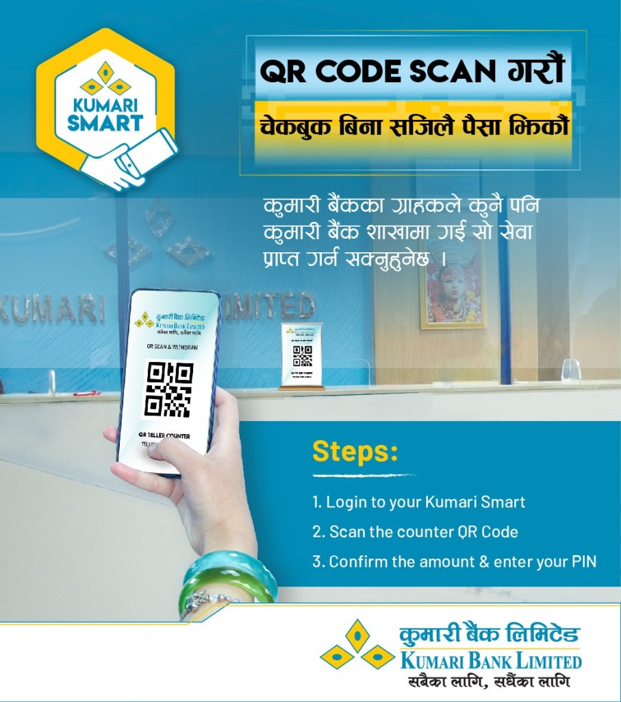 कुमारी बैंक लिमिटेडले क्यू आर स्क्यान एण्ड विथड्रल सुविधाको थालनी गरेको छ । उक्त सुविधा अन्तर्गत कुमारी बैंकका ग्राहकवर्गहरुले बिना कार्ड या चेक आफ्नो कुमारी स्मार्ट मोबाइल एप्लिकेसन मार्फत टेलरमा राखिएको क्यू आर कोड स्क्यान गरी आफ्नो खाताबाट नगद विथड्र गर्न सक्नेछन् ।
