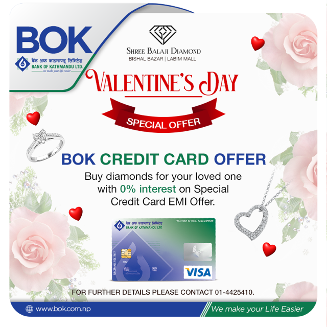 बंैक अफ काठमाण्डू लिमिटेडले आफ्ना क्रेडिट कार्ड बाहक ग्राहक महानुभावहरुलाई “भ्यालेन्टाइन डे” को अवसरमा गरगहना खरिदको लागि इएमआई सुबिधा ल्याएको छ । सामान्यतया भ्यालेन्टाइन डे मा आफुलाई मन पराउने मायालुलाई उपहार स्वरुप विभिन्न गरगहनाहरु दिने चलन चल्दै आईरहेको छ । यसै अवसरलाई मध्यनजर गर्दै यस बैंक अफ काठमाण्डू लिमिटेडले बालाजी डाईमण्ड, बिशाल बजार र बालाजी डाईमण्ड एण्ड ज्वैलर्स, लबिम मलसंगको सहकार्यमा ग्राहक महानुभावहरुलाई गरगहना खरिदको लागि इएमआई सुबिधा ल्याएको छ । यस इएमआई सुबिधामा ग्राहक महानुभावहरुले रु. ४० हजार देखी रु. ५ लाखसम्मको गरगहना खरिद गर्न सक्नुहुनेछ ।