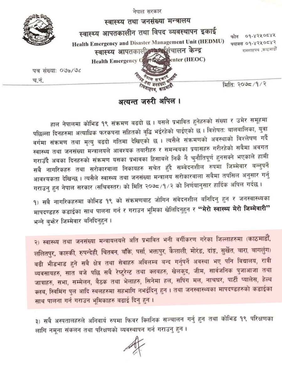 ‘अति प्रभावित भनी वर्गीकरण गरेका जिल्लाहरुमा बढी भीडभाड हुने सबै क्षेत्र तथा सेवाहरु अविलम्ब बन्द गर्नुपर्ने भएपनि विद्यालय, रात्री व्यवसाय, ७ बजेपछि सबै रेष्टुरेन्ट तथा क्लबहरु, खेलकुद, जीम, सार्वजनिक पूजाआजा तथा जात्राहरु, सभा सम्मेलन, बैठक तथा भेलाहरु, सिनेमा हल, सपिङ मल, नाचघर, पार्टी प्यालेस, हेल्थ क्लब, स्विमिङ पुल आदि स्थानमा सहभागी नभई दिनु’ स्वास्थ्य आपतकालीन कार्यसञ्चालन केन्द्रले भनेको छ ।
