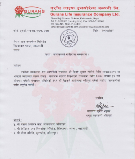 गुँरास लाइफ इन्स्योरेन्सको सञ्चालक विनय कुमार तोदीले राजिनामा दिएका छन् । तोदीले असार ११ गते व्यक्तिगत कारण देखाई सञ्चालक पदबाट राजिनामा दिएका हुन् । कम्पनीको असार १४ गते बसेको सञ्चालक समितिको बैठकले उनको राजिनामा स्वीकृत गरेको छ ।
