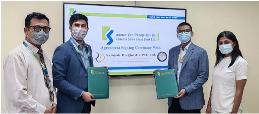 कामना सेवा विकास बैंक र सम्यक डाईग्नोष्टिक प्रा.लि. बीच मर्चेन्ट सम्झौता सम्पन्न भएको छ । यस सम्झौतापछि कामना सेवा विकास बैंकका कर्मचारी तथा ग्राहक महानुभावहरुले सम्यक डायग्नस्टिकमा स्वास्थ परिक्षण गराउँदा १५ प्रतिशतको छुट प्राप्त गर्न सक्नेछन् । यो सुविधा सम्यक डाईग्नोष्टिकको जावलाखेल तथा मध्य बानेश्वरमा रहेका शाखाबाट प्राप्त हुनेछ ।