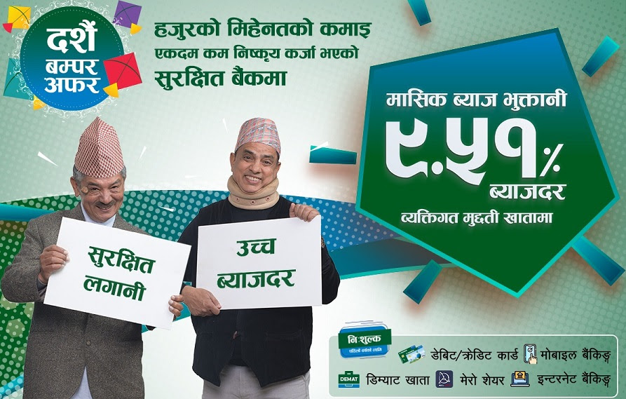 नेपालीहरुको महान पर्व बडा दशैंको अवसरमा सानिमा बैंकले ग्राहकहरुको लागि विशेष दशैं बम्पर योजना सार्वजनिक गरेको छ । आश्विन १ गतेदेखि लागू हुने सो योजना अन्तर्गत व्यक्तिगत मुद्दती खातामा ९.५१ ५ सम्म उच्च ब्याजदर मासिक रुपमा प्रदान गरिने बैंकले जनाएको छ ।